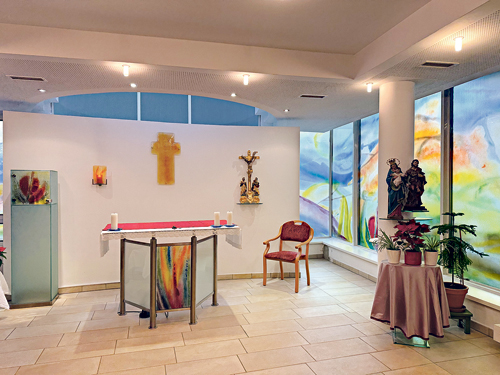 Ein seelsorglicher Schwerpunkt besteht auch in der Begleitung sterbender Heimbewohner:innen. „Wir Schwestern halten bei den Sterbenden Sitzwache, beten mit ihnen oder für sie“, erklärt Sr. Susanne und hat dabei auch die Angehörigen der Sterbenden im Blick, die die Schwestern in dieser herausfordernden Situation unterstützen und begleiten bis hin zur Verabschiedung vom Leichnam und einem jährlichen Gedenkgottesdienst für alle Verstorbenen des Hauses. Die Kapelle bildet natürlich ein Zentrum der Seelsorge im FraDomo Gallspach – mit der wöchentlichen Eucharistiefeier, weiteren Feiern im Laufe des Kirchenjahres und der Organisation der Krankenkommunionen. „Wichtig ist mir auch der Austausch mit Mitarbeiterinnen und Mitarbeitern aus den verschiedenen Bereichen wie Pflege, Reinigung, Hausleitung und natürlich die Mithilfe von Freiwilligen“, betont Sr. Susanne.