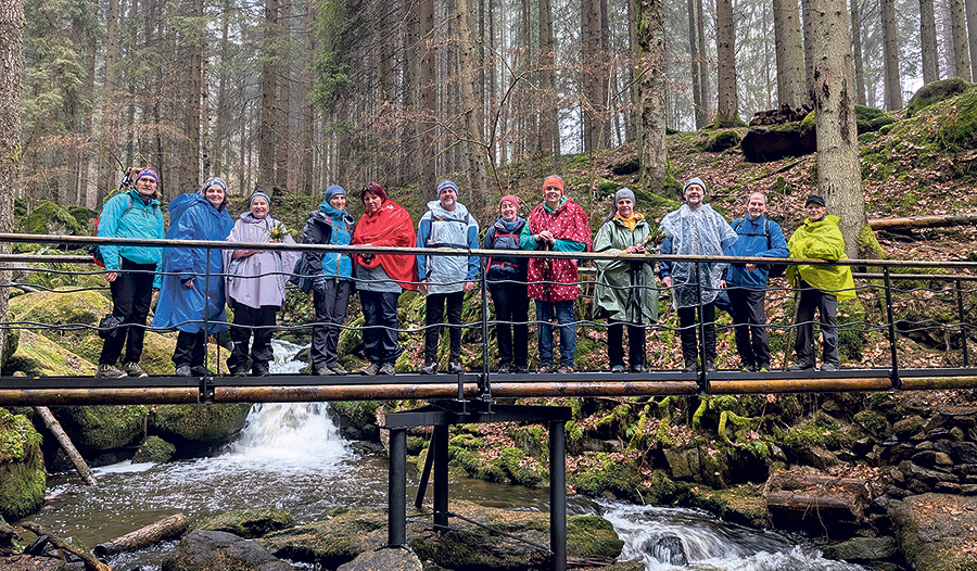 Zum Foto: Der Abt des Stiftes Wilhering Reinhold Dessl (3. v. re.) war in der Vorwoche zur Ausbildung der „PilgerWegWeiser“ (Begleiter:innen) auf dem Wilheringer Pilgerweg unterwegs. Die Gruppe machte bei den Wolfgang-Wasserfällen am Abtweg Halt.