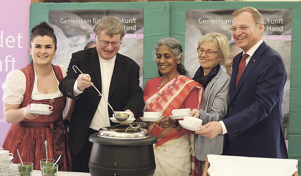 Bild: Benefizsuppen-Essen im Landhaus. Monika Dornetshuber (links) brachte nicht nur frischen Wind auf die Bühne, sondern kredenzte auch eine g‘schmackige Suppe für die Festgäste. Bischof Manfred Scheuer teilte die Suppe aus, die u. a. Projektpartnerin Ajitha Georg aus Indien, Paula Wintereder, Vorsitzende der kfb oö und Landeshauptmann Thomas Stelzer verkosteten.