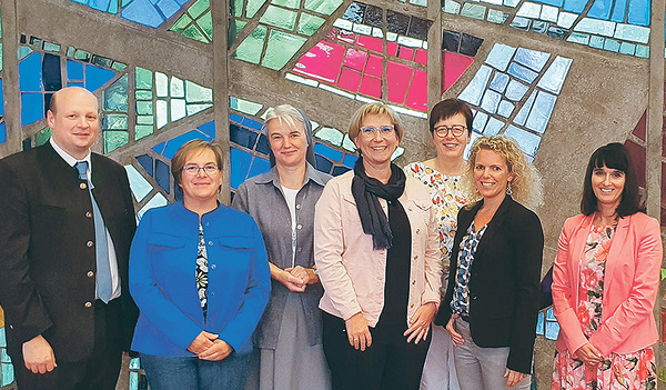 Zum Foto: Sebastian Hochradl, Leiter der Abteilung Pfarrverwaltung und Pfarrpersonal in der Diözese Linz (links), Sr. Berta Bumberger, Geistliche Assistentin der Berufsgemeinschaft der Pfarrsekretärinnen (3. von links) und Ines Schaupp-Steinhäusl, Referentin Pfarrpersonal (rechts) mit den Vorstandsmitgliedern Margareta Schneider (2. v. links), Sandra Schaumberger, Ulrike Strasser und Romana Hangl-Huemer; der neu gewählte Vorstand der Pfarrsekretärinnen ist noch nicht im Amt.