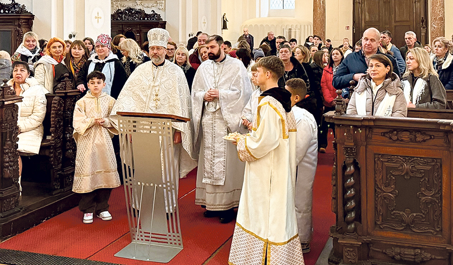 Zum Foto: Zu den Patroziniumsfeiern der ukrainischen Gemeinde in Linz konnte ihr Seelsorger Andrii Kityk auch P. Yuriy Kolasa (mit einer Mitra als Kopfbedeckung) begrüßen, der als Generalvikar für alle mit Rom unierten Ostkirchen in Österreich verantwortlich ist.