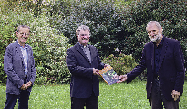 Das Jahrbuch ruft zudem in einer umfassenden Chronik die wichtigen kirchlichen Ereignisse zwischen Juli 2019 und Juni 2020 in Erinnerung. Der aktuelle Schematismus gibt Auskunft über Zuständigkeiten von der Weltkirche, der Kirche Österreichs und der Diözese Linz bis zu den Orden und Pfarren. Gestaltet wurde das Buch von Matthäus Fellinger (Bild links). Herausgeber Bischofsvikar Wilhelm Vieböck (rechts) übergab ein Exemplar an Diözesanbischof Manfred Scheuer (Mitte), der selbst über „Gotteserinnerung“ einen Beitrag für das Jahrbuch geschrieben hat.