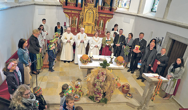 Das Gotteshaus wurde von Grund auf saniert, drei Kilometer Kabel wurden neu verlegt, 700 Kilogramm Kalkfarbe für Wände und Gewölbe verbraucht, und die Beleuchtung wurde erneuert. Pfarrassistentin Anna-Maria Marschner (im liturgischen Kleid, rechts) dankte allen für die Mithilfe und die Spenden. Freiwillige Helfer/innen haben über 1.200 Stunden mitgearbeitet. So war in diesem Jahr das Erntedankfest besonders von der gelungenen Kirchenrenovierung geprägt.