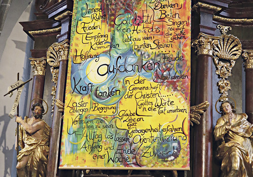 Ursula Hofer hat daraus ein Fastentuch gestaltet, das im Wechsel mit einem zweiten Fastentuch vor dem Altar anbracht wird. Obwohl das „heurige“ Fastentuch nicht mehr neu ist, rufe es immer wieder ein positives Echo hervor, erzählt Pfarrer Arbeithuber.