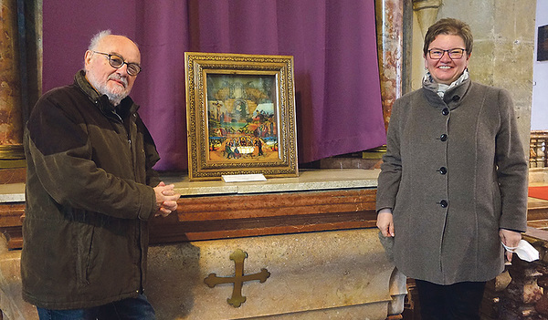 Freistadt. Ein schönes Geschenk machte Gottfried Kerschbaummayr (im Bild links mit der leitenden Pfarrseelsorgerin Irmgard Sternbauer) der Stadtpfarrkirche Freistadt. In Hinterglastechnik ausgeführt zeigt seine Fastenkrippe Motive vom Abendmahl bis zur Auferstehung. Die Krippe lädt bis Ostermontag zum Meditieren und Betrachten ein. Am Karfreitag zeigt Gottfried Kerschbaummayr seinen Kreuzweg in Wort und Bild um 15 Uhr.