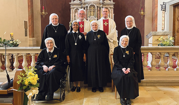 Sitzend links Sr. Christiana Schönhuber, rechts Sr. Johanna Franziska Wimhofer (beide 60 Jahre), stehend von links: Generaloberin Sr. Cordula Kreinecker, Sr. Tania Joseph (25 Jahre), Sr. Anita Parzer (60 Jahre), Konventoberin Sr. Basilides Steinmaßl; Priester: links Bischofsvikar Adi Trawöger, rechts Pfarrer Karl Stockinger.
