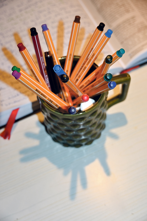 Ein Becher, in dem sich Fineliner aller Farben befinden, eine Füllfeder und ein Schreibbuch im A4-Format – das ist die Grundausstattung, die Beatrix Penninger aus Wolfsegg am Hausruck benötigt. Tag für Tag führt sie – sie arbeitete bis zur Pensionierung als Sekretärin – Tagebuch. Wobei Tagebuch nur ungenau charakterisiert, was sie tatsächlich tut. Beatrix Penninger versteht sich als Chronistin und verdeutlicht ihre Beschäftigung mit einem Bild: „Das ist, wie wenn man einen Zopf aus Germteig mit drei Strängen macht.“ Der erste Strang besteht aus den Erlebnissen des Alltags, der zweite aus den Ereignissen der Welt draußen und der dritte Strang ist die Bibel.