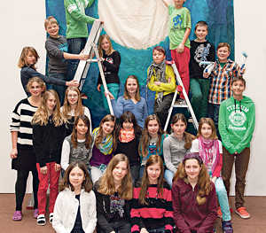 Schüler/innen der Musikhauptschule Eggelsberg schufen das Fastentuch. Seit Aschermittwoch hängt nun das Bild in Blau in der Pfarrkirche Eggelsberg, und die Freude daran ist groß.