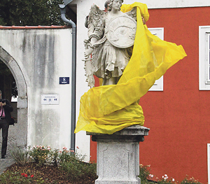 Leonding. Seit Ostern war der Pfarrpatron von Leonding, der hl. Michael, leuchtend gelb verhüllt.