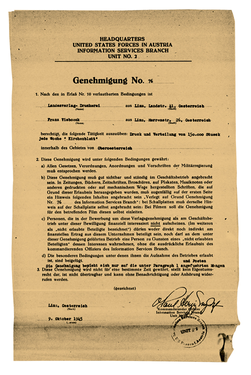 Neben dem Landesverlag als Druckanstalt steht daher auf dem in Englisch und Deutsch ausgefolgten Permit (Genehmigung) Nr. 76 vom 9. Oktober 1945 Franz Vieböck. Er hatte im Vorfeld einen Fragebogen ausfüllen und ein Gesuch abgeben müssen. Der Fragebogen hatte „einen Umfang, wie er mir sonst nie mehr im Leben begegnet ist“, erinnerte er sich später. Auf einem Mikrofilm hat der Fragebogen die Zeiten überdauert: Darin ging es neben Vieböcks politischer Zuverlässigkeit auch um die Frage, ob genügend Kapital für den Start des Kirchenblatts vorhanden sei.