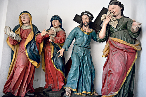 Verlässt man die Kirche, sieht man linker Hand eine Kapelle mit einer Pieta, die dreizehnte Kreuzwegstation. Einige Stufen führen hinab zu einer weiteren Kapelle, die der heiligen Helena geweiht ist. Helena, die Mutter Kaiser Konstantins des Großen, reiste 326 nach Jerusalem und errichtete dort im Auftrag ihres Sohnes das heute „Grabeskirche“ genannte Gotteshaus, nachdem sie das wahre Kreuz Christi entdeckt und den Ort der Kreuzigung sowie des Grabes Jesu identifiziert hatte. Helena wird in der Orthodoxie und in der katholischen Kirche als Heilige verehrt. Unmittelbar bei der Helena-Kapelle findet sich das Heilige Grab, nach der Kalvarienbergkirche das zweitgrößte Gebäude des Ensembles. Mit seinen zwei Räumen, der Engelkapelle und dem Grabraum, ist es dem Grab Jesu in Jerusalem nachempfunden. Bedeckt mit durchscheinendem Stoff liegt in der Grabkammer auf einer Steinbank eine Jesusstatue. Das Heilige Grab ist die vierzehnte Station des Kreuzwegs. Die betont schlichte Gestaltung der Kapelle steht in Kontrast zu den aufwendiger ausgeführten Kreuzwegstationen, ist aber dem Leidensweg Jesu entsprechend ein passender Abschluss.