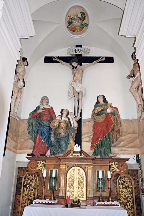 Das gesamte Kalvarienberg-Ensemble von Schenkenfelden ist von einer Mauer umgeben, von der ein Durchgang in den Friedhof führt. Der Friedhof wurde 1786 von der Pfarrkirche auf den Thierberg verlegt. Wenn man vor den Gräbern steht, kann man zu den Bauten von Tod und Auferstehung Jesu blicken, die eine Art „Skyline der Hoffnung“ bilden. Der vor etwas mehr als zehn Jahren mit großem Engagement der Bevölkerung renovierte Kalavarienberg ist frei zugänglich. Er ist ein kunstgeschichtlich besonderer und spirituell einladender Ort – zu jeder Zeit, ob tief verschneit oder in der Frühlingssonne.