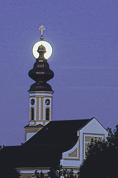 Helpfau. KiZ-Leser Johann Huber ist ein beeindruckendes Foto gelungen: Der Vollmond – aufgenommen im Juli 2020 – zieht hinter der Turmspitze der Pfarrkirche Helpfau vorbei.