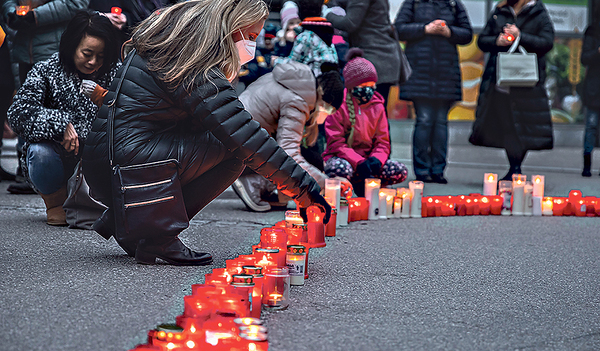 Ein aus Kerzen geformtes Herz und in der Mitte ein blau-gelbes Licht in den Nationalfarben der Ukraine und fünf Minuten Schweigen waren stille, dafür aber umso deutlichere Zeichen der Solidarität und des Zusammenhalts.