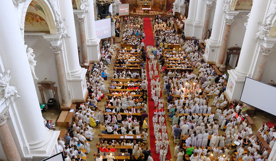 „Beim Ministrieren, da haben wir Spaß! Gemeinsam fröhlich sein, lachen und so versteh’n: Mit Jesus können auch Wunder gescheh’n!“, schallte es durch die Stiftsbasilika, als der wohl größte Chor an Ministrant:innen gemeinsam das Jungscharlied am Ende des Eröffnungsgottesdiensts des Minitags sang.