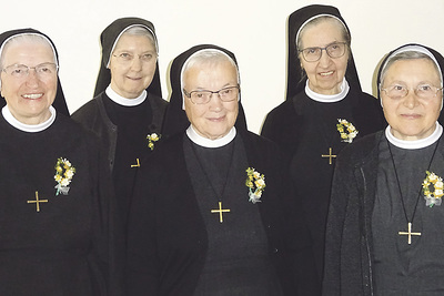 Kreuzschwestern. Im Rahmen eines Festgottesdienstes am 11. Mai 2019 in der Klosterkirche in Linz, dem Altabt Christian Haidinger OSB mit elf Zelebranten vorstand, feierten fünf Jubilarinnen im Kreise ihrer Mitschwestern, Angehörigen und Freunde 50 Jahre Ordensleben als Kreuzschwester: Sr. Maria Ancilla Zeinlinger (von links) aus Windhaag bei Freistadt, Sr. Irmlinde Lang aus Putzleinsdorf, Sr. Engelburga Barth aus Gramastetten, Sr. Fabiola Six aus Opponitz (NÖ) und Sr. Daria Gangl aus Reichenau.