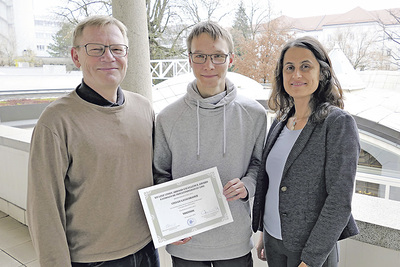 Katholische Universität (KU) Linz. Für seine hervorragenden akademischen Leistungen während seines Auslandssemesters am Institut Catholique de Paris im Wintersemester 2018/19 wurde Stefan Gassenbauer (Mitte), der derzeit die Masterstudien Kunstwissenschaft und Philosophie an der Katholischen Privat-Universität Linz absolviert, mit dem „KU Linz Study Abroad Excellence Award“ ausgezeichnet. Es gratulieren Univ.-Prof. Christoph Niemand (links), Vizerektor für Forschung und Internationalisierung, und Referentin Mag. Angelina Kratschanova. KU