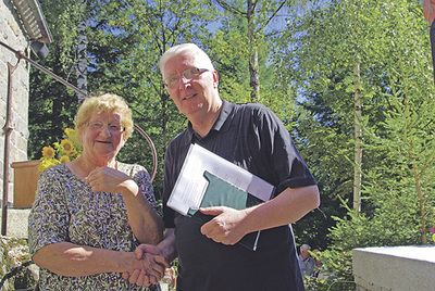 Schardenberg. Seit Jahrzehnten schon sorgt Maria Berndorfer bei den Wallfahrtstagen für den Blumenschmuck beim Freialtar der Fatimakapelle im Fronwald. Pfarrer Dr. Gregor Dabrowski (rechts) dankte Berndorfer für ihr Engagement und ihre Kreativität.