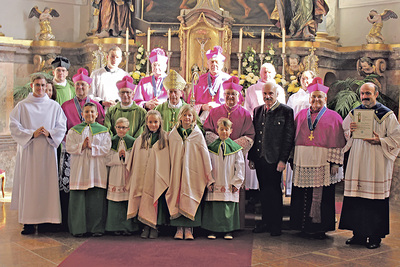 Kollegiatstift Mattighofen. Altbischof Ludwig Schwarz feierte am 14. Oktober 2018 in Mattighofen einen Festgottesdienst, mit dem der Wiederbelebung des Kollegiatstiftes vor zehn Jahren gedacht wurde, die in seine Verantwortung als Bischof fiel. Aktuell zählt die Propstei neben dem Stiftspropst fünf Kapitularkanoniker und vier Ehrenkanoniker. Damit sind die vorgesehenen Stellen besetzt. Musikalisch gestaltete die Stiftskantorei unter der Leitung von Zsuzsanna Kiss die Messe mit. Mit Applaus bekräftigten die Gottesdienstbesucher/innen die Auszeichnung von Walter Kirsch (rechts), der seit 41 Jahren den Mesnerdienst versieht.