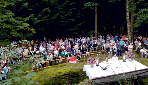 Dazu kommen aber noch Taufen und Hochzeiten, Wallfahrten von Pfarren, auch aus Bayern natürlich, Pilger:innen zu Fuß – der Einsatz, den die „Kapelle“ braucht, ist zweifelsohne eine Herausforderung für die 2.200 Katholik:innen zählende Pfarrgemeinde Schardenberg. „Aber der Einsatz lohnt sich auf jeden Fall“, betont Dirmhirn, selbst eine gebürtige Schardenbergerin: „Denn wann immer man die Fatimakapelle besucht, egal ob am Wochenende oder während der Woche, man ist nicht allein: Man trifft Wallfahrer:innen, Motorradfahrer:innen, Familien oder einzelne Personen, die Ruhe und Stille suchen oder bei der Muttergottes Hilfe erbitten. Die Fatimakapelle ist ein ganz besonderer Kraftplatz für alle Menschen. Alle sind willkommen. Oft sind es einfach auch Leute, die nur die Ruhe des Waldes genießen und die steinerne Kirche anschauen wollen.“ Das 75-Jahr-Jubiläum ist für die Pfarrgemeinde nicht nur Anlass, zurück, sondern auch nach vorne zu schauen. „Unser Anliegen ist es, die Fatimakapelle und das gesamte Areal für die Zukunft fit zu halten“, sagt die Sprecherin des Seelsorgeteams und betont, dass die Pfarrgemeinde alles tun werde, damit „die Menschen so wie bisher auch in den kommenden Jahren hier Kraft, Stille, Andacht und einen Ort zum Gebet finden. So wie sie es für sich wollen und brauchen.“ Die Pfarrgemeinde Schardenberg sei zu Recht auf ihr Heiligtum stolz, betont Andrea Dirmhirn: „Es ist ein Stück unserer Identität.“