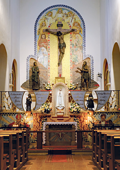 Die vielen Pilger:innen, die in immer größerer Zahl kamen, machten den Bau einer größeren Kapelle notwendig. Das Projekt war von Anfang an eine Herzensangelegenheit der gesamten Pfarrbevölkerung Schardenbergs: die Schenkung des Baugrunds, das Graben eines Brunnes, um Wasser für die Baustelle zu haben, die Granitsteine, die Bereitstellung von Sand, Schotter und Holz sowie 1.750 Arbeitstage und 978 Fuhrwerkleistungen – alles wurde ehrenamtlich von den Schardenberger:innen erbracht. Dazu kamen die Geldspenden, die bei Haussammlungen erbeten wurden. Nach zwei Jahren Bauzeit konnte das Heiligtum am 19. Mai 1951 von Bischof-Koadjutor Franz Zauner eingeweiht werden. Man kann Andrea Dirmhirn, der Sprecherin des Seelsorgeteams von Schardenberg, nur zustimmen, wenn sie sagt: „Die Fatimakapelle gehört zu uns. Pfarrgemeinde und die politische Gemeinde sind in gleicher Weise stolz darauf, dass wir sie haben.“ Das Gebäude aus Granitstein mit einem mächtigen Turm und rund 120 Sitzplätzen wird von den Schardenberger:innen Fatimakapelle genannt, obwohl sie durchaus die Größe einer Kirche hat. Zu den Besonderheiten des Heiligtums gehört die Gnadenstatue „Unserer lieben Frau von Fatima“. Sie wurde von demselben Künstler gefertigt, der auch das Original in Fatima geschaffen hat. Gemeinsam mit rund 1.000 österreichischen Kindern, die 1949 von einem Erholungsaufenthalt aus Portugal zurückkehrten, kam die Gnadenstatue nach Österreich, wo sie einen Monat lang in verschiedenen Linzer Kirchen zur Verehrung aufgestellt wurde, ehe sie in Schardenberg ihren Bestimmungsort fand. Dort thront sie nicht hoch oben am Hochaltar, „sondern herunten am Gnadenaltar ganz nahe beim Volk“, wie im aktuellen Kirchenführer zu lesen ist. Einige Jahre später wurde die Statue mit einer goldenen Krone gekrönt, in die eine Reihe von biblischen und anderen Symbolen eingearbeitet sind – bis hin zu einer Atomwolke, die vom Kreuz überragt wird.
