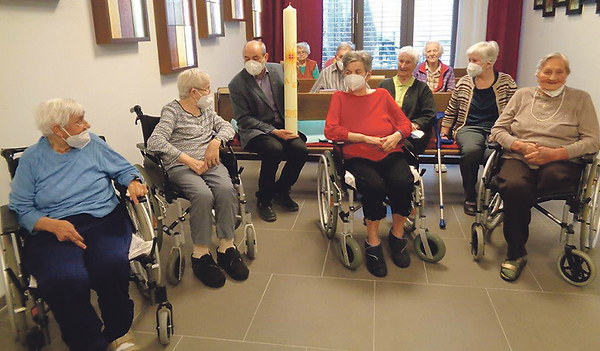Das zentrale Symbol auf der Kerze bildet die Sonne, die auf den auferstandenen Christus verweist. In einer Übergabefeier überreichten die Bewohner/innen die Kerze in der Kapelle des Heimes an Pfarrer Hans Padinger (mit der Kerze in der Hand).