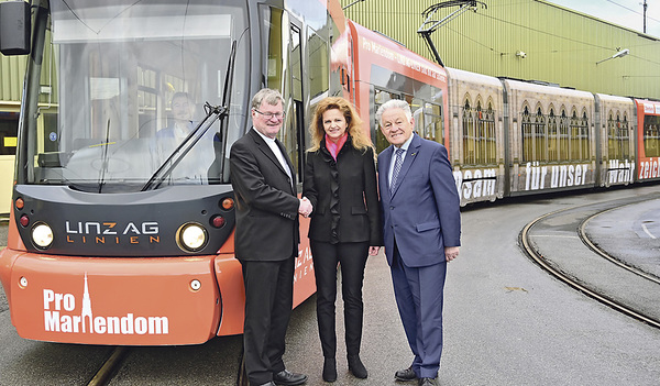 „Dadurch wird der Mariendom als Kulturdenkmal und Wahrzeichen entlang der vier Straßenbahnlinien auch in den Linzer Stadtteilen sichtbar gemacht“, erklärt Jutta Rinner (Mitte), Vorstandsdirektorin von LINZ AG LINIEN, den beiden Proponenten der Initiative „Pro Mariendom“, Bischof Manfred Scheuer und Altlandeshauptmann Josef Pühringer. LINZ AG LINIEN hat diese aufmerksamkeitsstarke Werbung ermöglicht.
