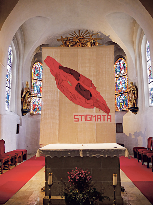 „Inspiriert von der Kreuzigungsgruppe im linken Seitenschiff unserer Kirche, besonders von den Wundmalen Christi, habe ich das heurige Fastentuch entwickelt“, erklärt die Religionspädagogin Marion Grubelnik aus Hörsching. Das Material des Fastentuchs ist in Anklang an die Kleidung zur Zeit Jesu und an grobe Bußgewänder eine „Leinwand“ aus handgewebtem, altem Bauernleinen, gestiftet von Gertraud und Johann Putz aus Grossenschwandt. Auf dem Tuch findet sich mit roten Stoffen ausgeführt eine klaffende Wunde, die an die Seitenwunde Christi erinnert, dazu kommt der Schriftzug „Stigmata“. „Die Darstellung soll zum Nachdenken über Stigmata anregen, über Wundmale, Verwundungen, wunde Punkte, soziale Makel und Etikettierungen“, erläutert Marion Grubelnik.