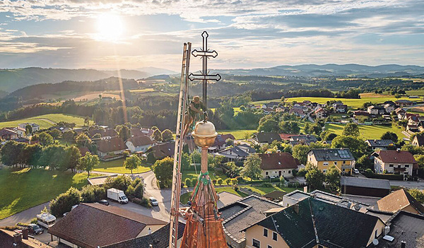 Nach dem Aufziehen der „goldenen“ Kugel, in der sich die Zeitkapsel mit historischen und aktuellen Dokumenten befindet, wurde in einer Andacht das Kreuz von Altpfarrer Josef Wundsam gesegnet.