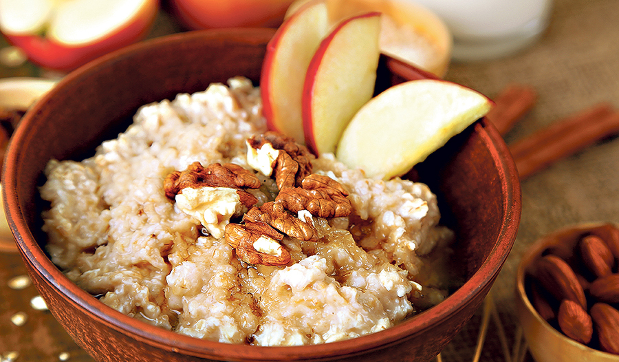 Dinkelflocken, geriebener Apfel, Gewürze und Rosinen mit Wasser kurz aufkochen – ausquellen lassen und mit etwas Honig süßen. Eventuell mit Flohsamenschalen und geriebenen Mandeln bestreuen.