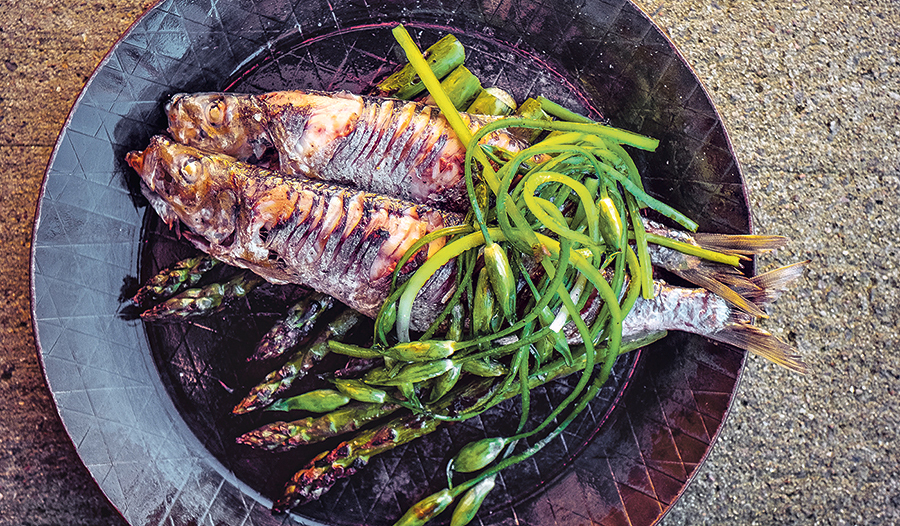 Spargel mit den Heringen und Bärlauchknospen anrichten.