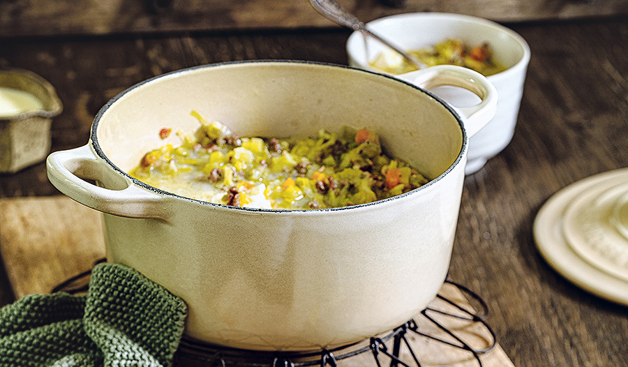Karotten, Kartoffeln, Lauch und Brühe zugeben und bei geschlossenem Deckel 20-25 Minuten weich dünsten.