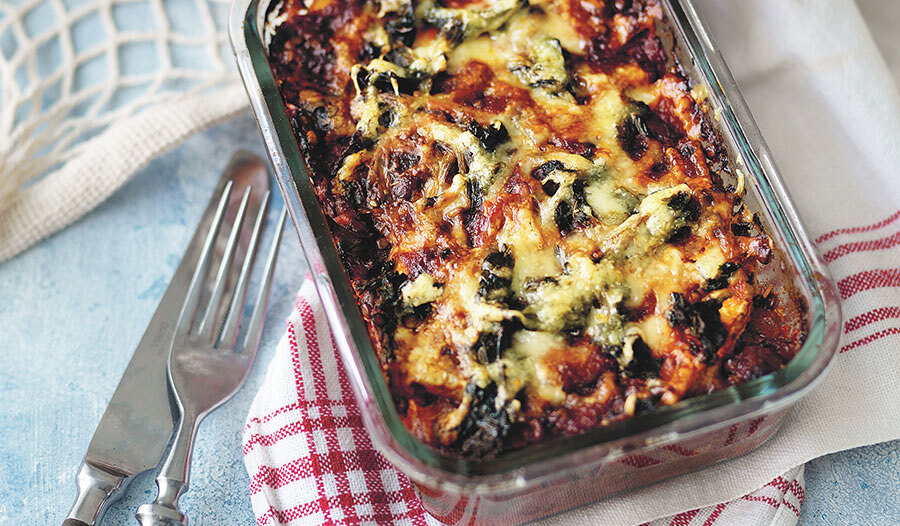 Eine ofenfeste Auflaufform mit etwas Öl einfetten. Wie bei einer Lasagne abwechselnd Sauce, Sellerie und Spinat einschichten. Mit dem Käse bestreuen und im Ofen 45 Minuten backen.