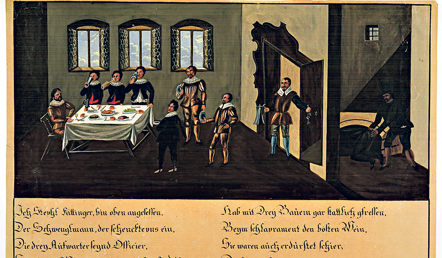 Zu Bild 1: Mai 1626: Bauernführer Stefan Fadinger hat das Stift Kremsmünster eingenommen. Die Sache ging glimpflich für das Stift aus, da man die Bauern gut verpflegte. Das Bild zeigt Fadinger (links) bei einem Festmahl mit Bauern, bedient durch das Stiftspersonal.