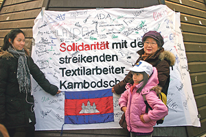 Faire Arbeitsbedingungen für Textilarbeiter/innen in Kambod­scha forderten am 10. Jänner bei einer Kundgebung am Linzer Taubenmarkt etwa 200 Demonstrant/innen.