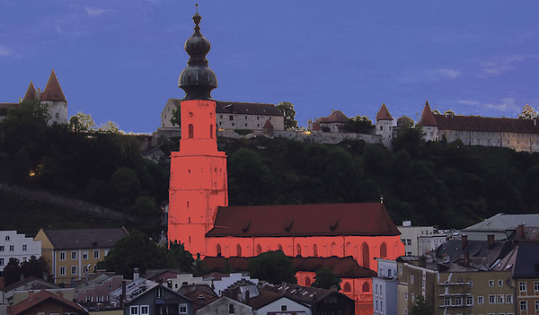 Rot glühend wird die Pfarrkirche St. Jakob in der Altstadt Burghausens am 6. Oktober 2018 die „Nacht der offenen Kirchen“ signalisieren: Sechs Kirchen, davon eine am gegenüberliegenden österreichischen Salzachufer in Ach, locken mit Licht- und Klanginstallationen, Konzerten und Andachten zu einem außergewöhnlichen Erlebnis. Zentraler Auftakt des vielfältigen Programms ist um 19 Uhr eine Andacht in der Kirche Maria Ach.