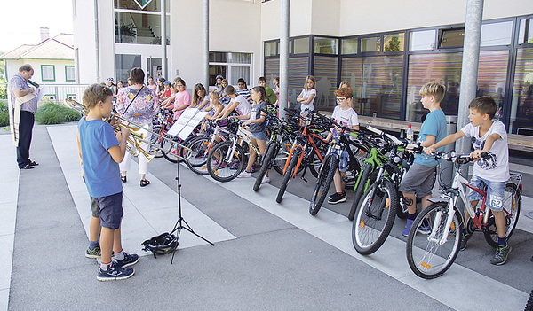 Danach gab es vor der Schule eine Fahrrad- und Schülersegnung. Das Wetter meinte es gut und so gab es statt Glockengeläute ein Klingeln mit den Fahrradglocken und am Ende der Feier wurden alle auf das Abenteuer Radfahren entlassen.