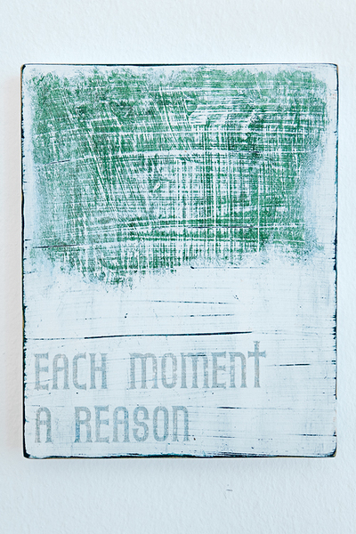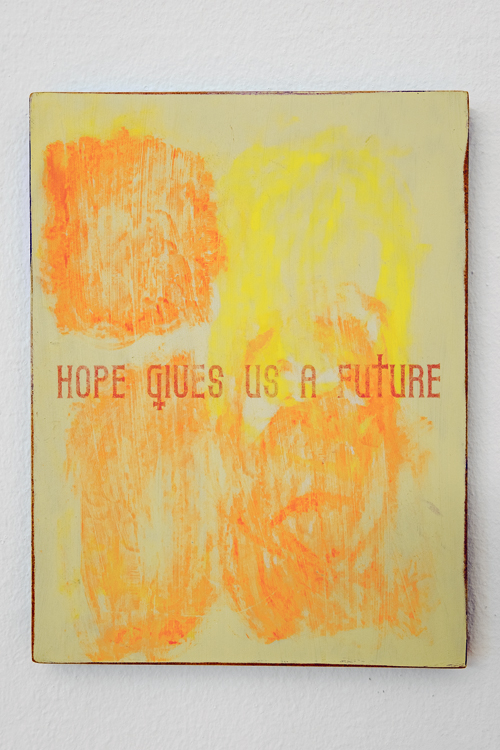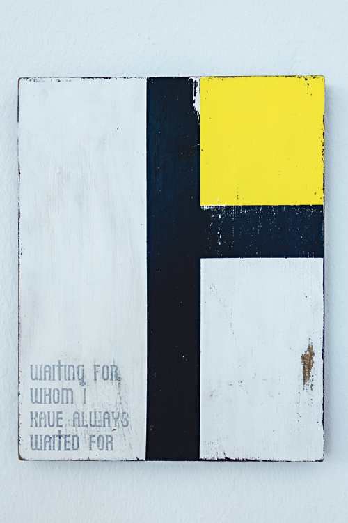 Die ortsspezifische Arbeit verbindet erstmals Festsaal und Kapelle: Die mit englischen Textbausteinen versehenen Acrylbilder auf MDF-Platten wurden dafür neu geschaffen. Und wie entstehen Text und Bild? „Der Text findet das Bild“, sagt dazu Heribert Friedl. „Pray with me“ heißt es etwa bei der 6. Station: „Mit wem kann ich noch beten? Mit wem kann ich die Gottesfrage teilen?“ – Nicht nur im Advent eine spannende Frage.