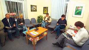 An der Bushaltestelle. Menschen warten, der Bus hat Verspätung. Nervös steigen die einen von einem auf den anderen Fuß. Andere blicken leer nach Irgendwo. Oder spielen mit dem Handy ...