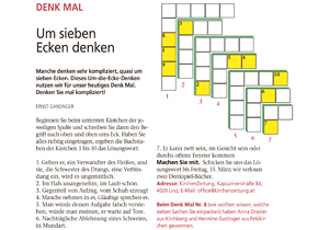 06.03.2013 Denk mal: Um sieben Ecken denken Manche denken sehr kompliziert, quasi um sieben Ecken. Dieses Um-die-Ecke-Denken nutzen wir für unser heutiges Denk Mal. Denken Sie mal kompliziert! mehr: Denk mal: Um sieben Ecken denken