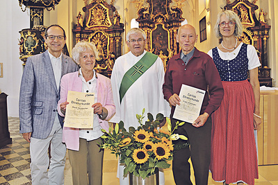 Ebensee. Beim Gottesdienst am Sonntag, 11. August ehrte die Pfarre Ebensee ihre langjährigen Caritas-Haussammler/innen. Seit 20 Jahren sind Johanna Pfatschbacher und Franz Kasberger im Dienst der Caritas unterwegs, seit 30 Jahren Elisabeth Kienesberger, Gertrude Scheck, Annemarie Spitzer, Christl Fink, Mathilde Leitner, Maria Spitzer und Karl Schwaiger. Seit 40 Jahren bitten Hilde Autengruber und Veronika Steinkogler um eine Spende. Maria Neubacher und Franz Stöttinger (beide im Bild) gehen seit 50 Jahren für die Caritas von Haus zu Haus.