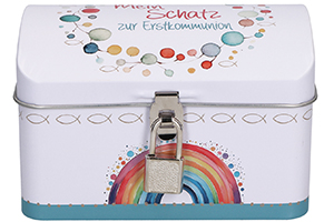 Farbig bedrucktes Metallkästchen mit Schloss, gefüllt mit vielen bunten Geschenken zur Erstkommunion (14,5 x 7,5 x 9,5 cm), das sich auch gut für die Aufbewahrung der schönsten Erinnerungen an die Erstkommunion eignet. Folgende Schätze sind enthalten: